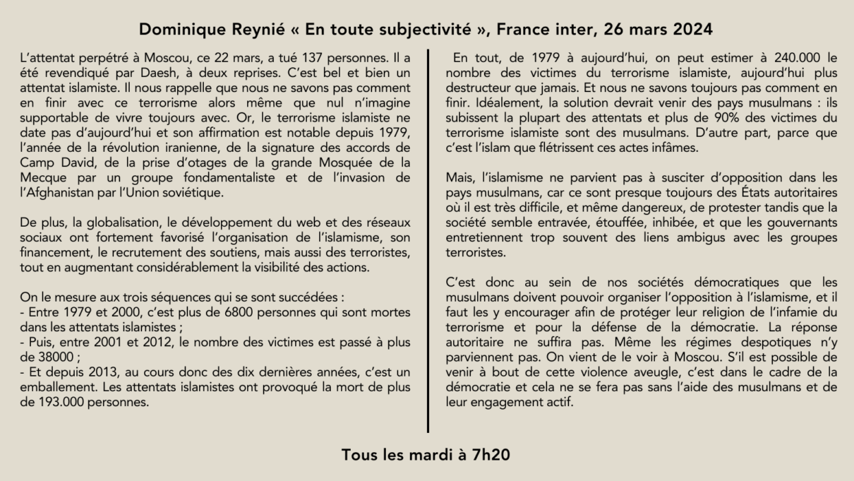 🎙️La chronique de @DominiqueReynie: "Depuis 1979, on peut estimer à 240 000 les victimes du terrorisme islamiste. Nous ne pourrons pas venir à bout de cette violence aveugle sans l’engagement actif des musulmans" 👉Les chroniques https://t.co/QecuhlF5iY 🗓️Mardi à 7h20 pic.twitter.com/JGqEA5B7l5