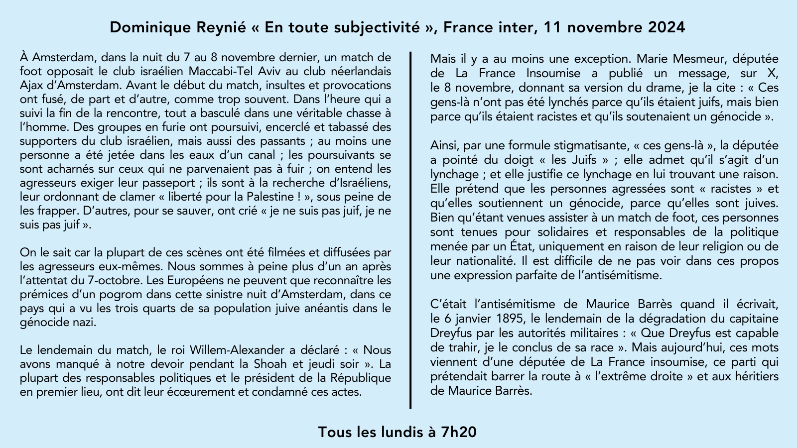 La chronique de @DominiqueReynie: «Ces gens-là n’ont pas été lynchés parce qu’ils étaient Juifs, mais bien parce qu’ils étaient racistes et qu’ils soutenaient un génocide». Violences à Amsterdam: les mots d’une députée LFI.