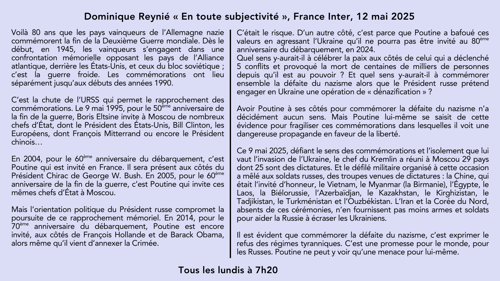 Sur @franceinter, @DominiqueReynie chez @ndemorand: «Il est évident que commémorer la défaite du nazisme, c’est exprimer le refus des régimes tyranniques. C’est une promesse pour le monde, pour les Russes. Poutine ne peut y voir qu’une menace pour lui-même». pic.twitter.com/i6nyX9PHrt