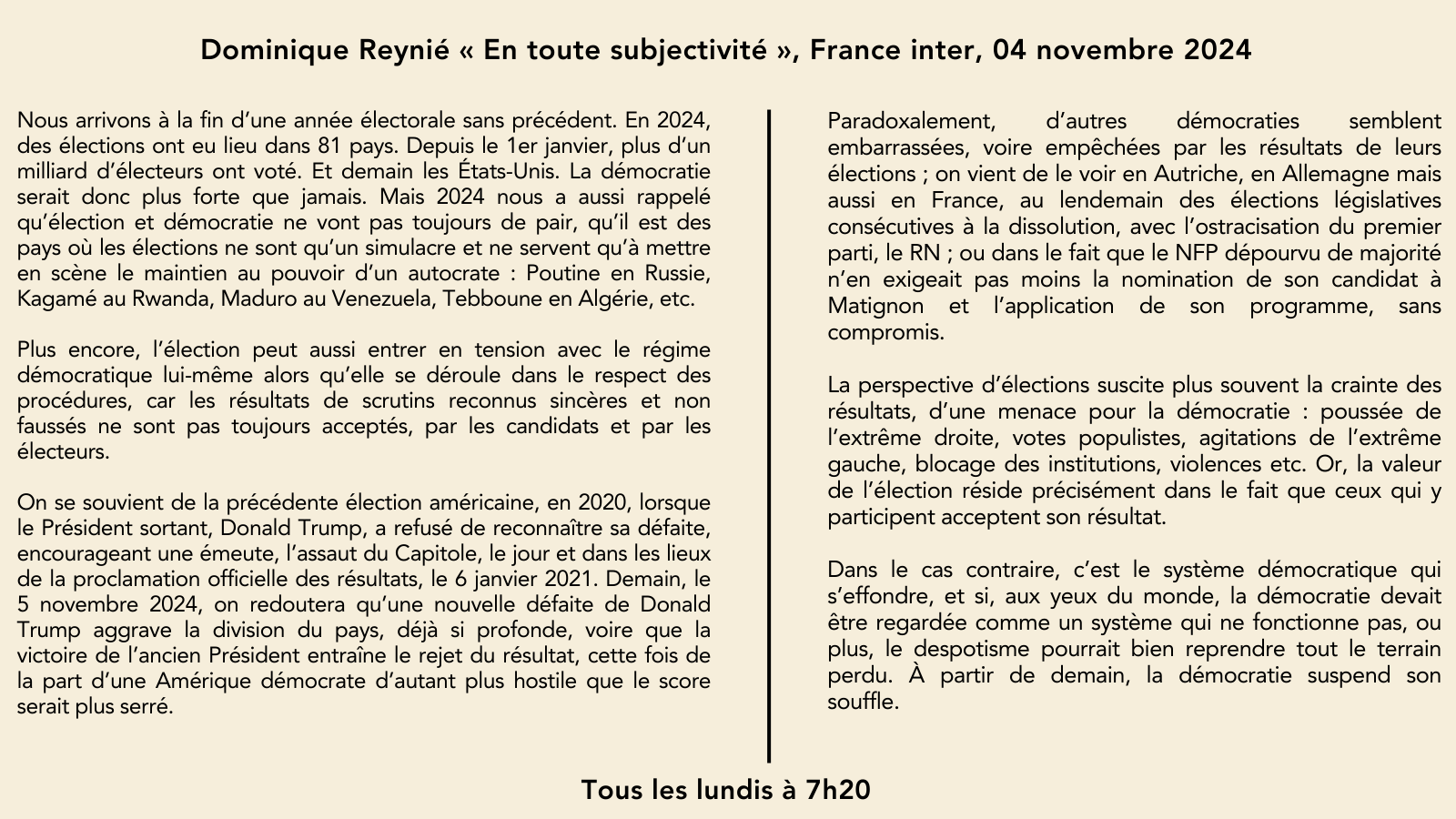 La chronique de @DominiqueReynie sur @franceinter : « L’élection ne suffit pas à garantir la démocratie. Les résultats ne sont pas toujours acceptés, par les candidats et par les électeurs même s’il n’y a pas eu d’irrégularité. » Les chroniques https://t.co/QecuhlF5iY Le lundi,… pic.twitter.com/a83DwjutYE — Fondation pour l’innovation politique (@Fondapol) November 4, 2024