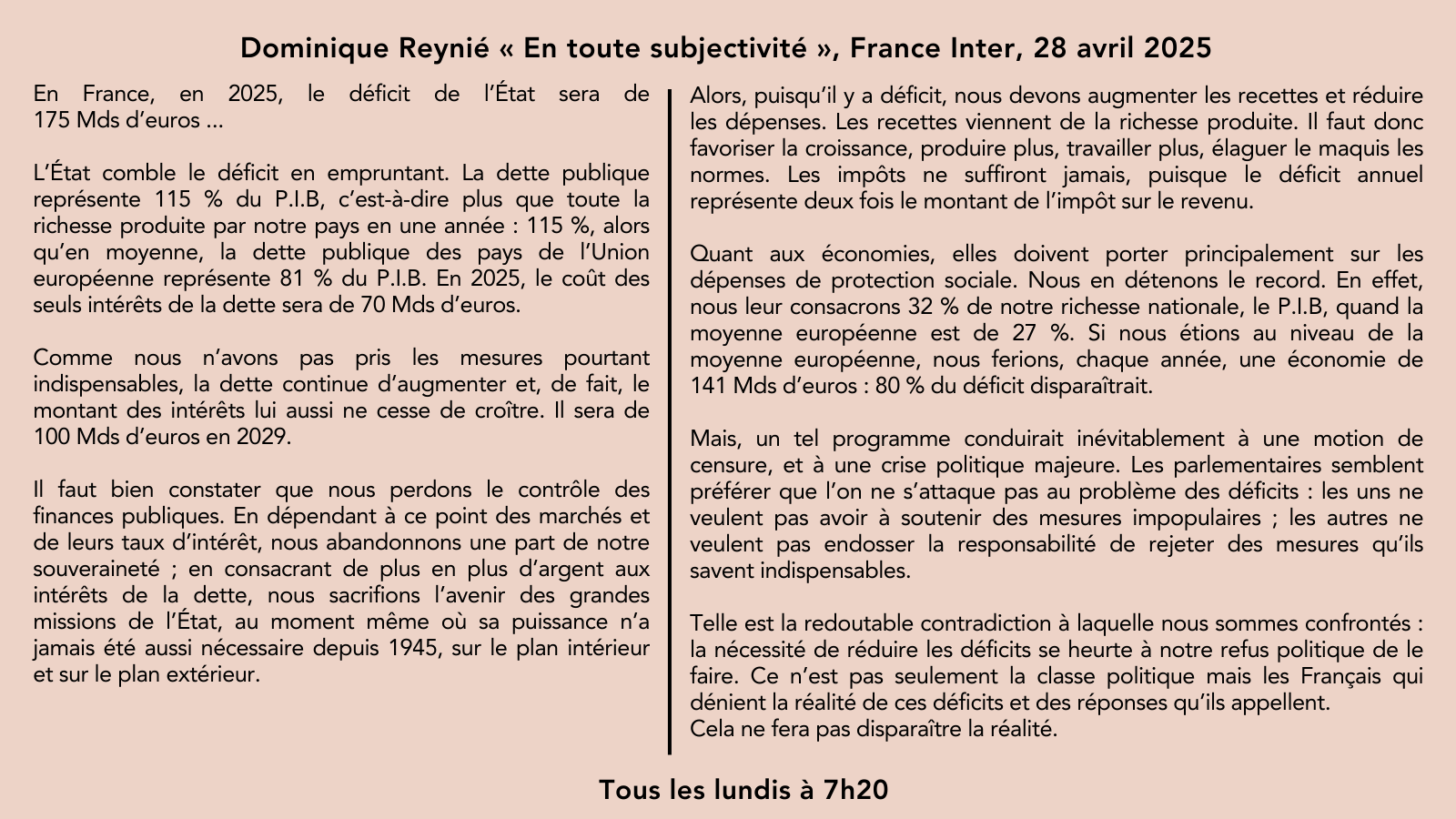 «La nécessité de réduire les déficits se heurte à notre refus politique de le faire. Ce n’est pas seulement la classe politique mais les Français qui dénient la réalité de ces déficits et des réponses qu’ils appellent. Cela ne fera pas disparaître la réalité»@franceinterpic.twitter.com/ZWzMQhDz4F