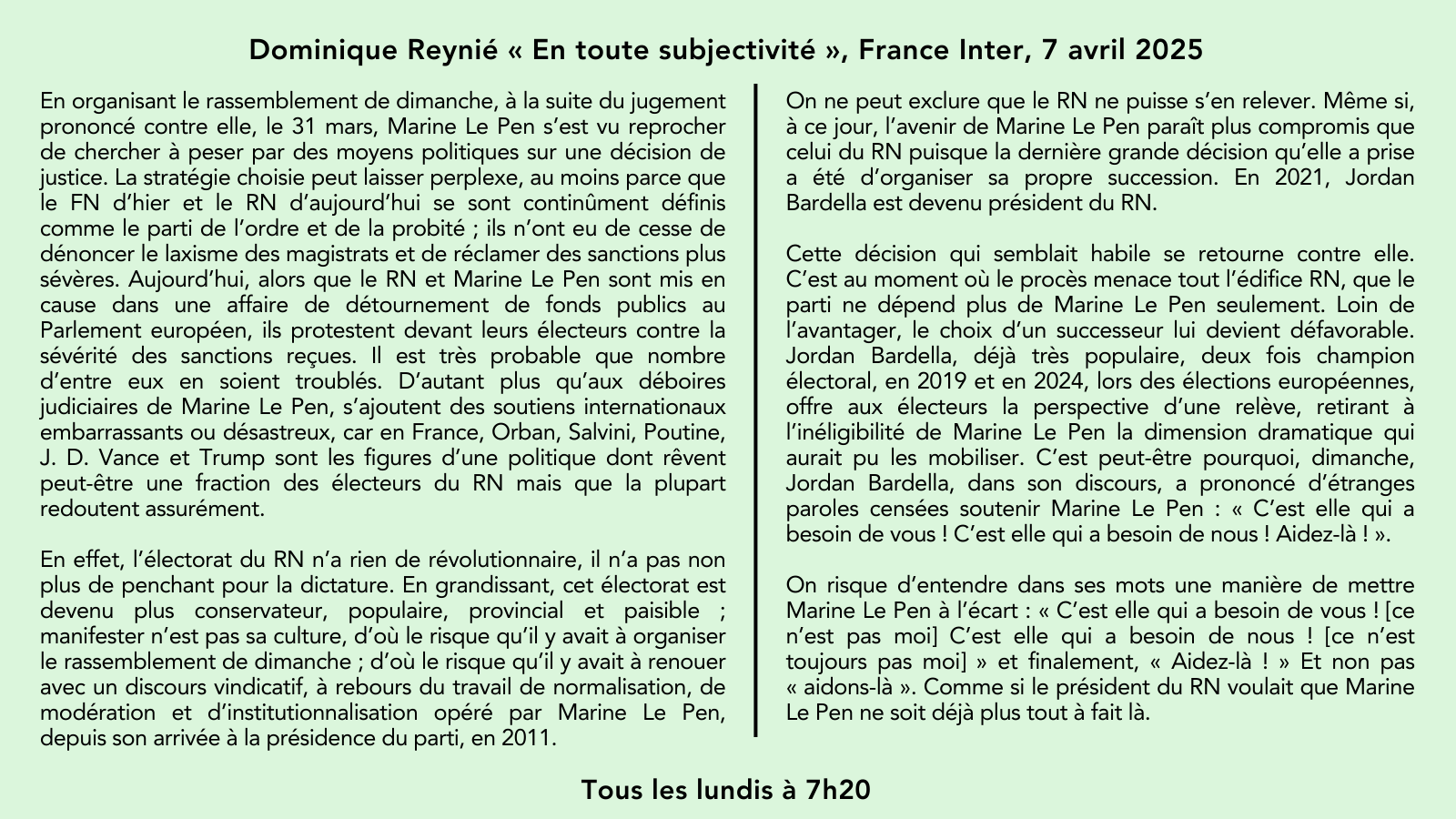 La chronique de @DominiqueReynie sur @franceinter: « Le RN, en fin de cycle ou en bout de course? Dimanche, Jordan Bardella, dans son discours, a prononcé d’étranges paroles comme s’il voulait que Marine Le Pen ne soit déjà plus tout à fait là. » pic.twitter.com/SXRtfFtUyt