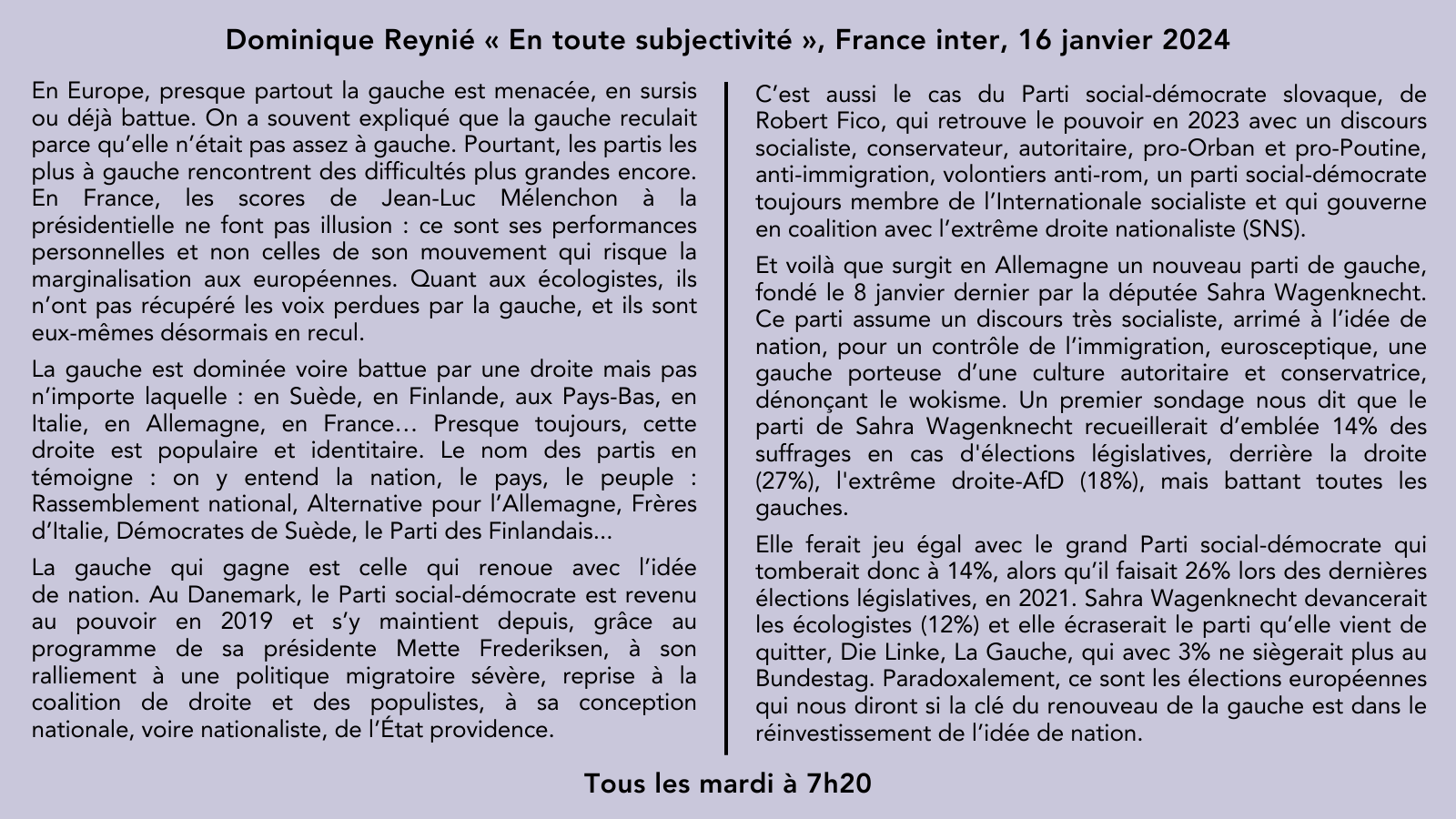 🗨️La chronique de @DominiqueReynie sur @franceinter: « En Europe, presque partout, la gauche est menacée, en sursis ou déjà battue. La gauche qui gagne est celle qui renoue avec l’idée de nation. » 👉Les chroniques: https://t.co/QecuhlF5iY 🗓️Le mardi à 7h20 pic.twitter.com/EXnwnKAurH — Fondation pour l’innovation politique (@Fondapol) January 16, 2024