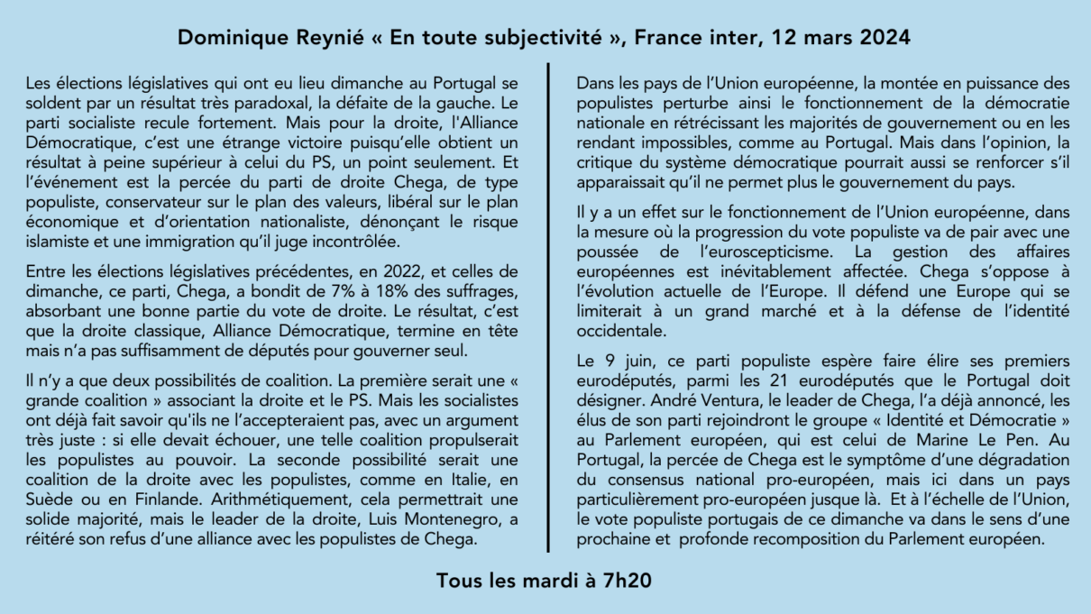 🎙️La chronique de @DominiqueReynie sur @franceinter: « Au Portugal, la percée de Chega est le symptôme d’une dégradation du consensus national pro-européen, dans un pays particulièrement pro-européen jusque là ». 👉Les chroniques: https://t.co/QecuhlF5iY 🗓️Le mardi à 7h20 pic.twitter.com/crAq3pdDHy