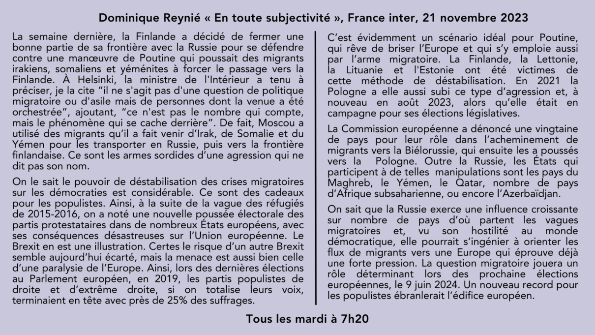 🎙️Sur @franceinter la chronique de @DominiqueReynie: « Les crises migratoires déstabilisent les démocraties. C’est le scénario idéal pour Poutine, qui rêve de briser l’Europe et s’y emploie aussi par l’arme migratoire. » 👉Les chroniques: https://t.co/QecuhlFD8w 🗓️Le mardi à 7h20 pic.twitter.com/53eGddrjmh — Fondation pour l’innovation politique (@Fondapol) November 21, 2023