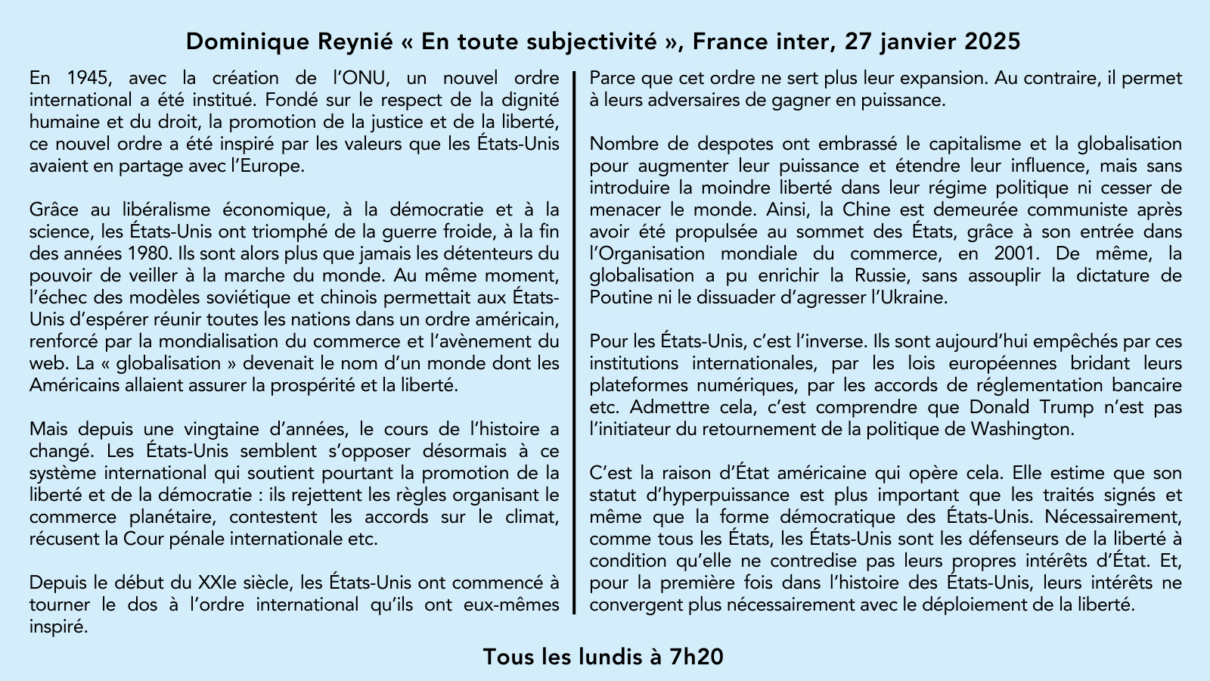 La chronique de @Dominiquereynie sur @franceinter «Dès le début du XXIe siècle, les États-Unis ont commencé à tourner le dos à l’ordre international qu’ils ont eux-mêmes inspiré mais qui ne sert plus leur expansion». Les chroniques https://t.co/FwTdDtsSTc pic.twitter.com/DZY4CKr2E8 — Fondation pour l’innovation politique (@Fondapol) January 27, 2025
