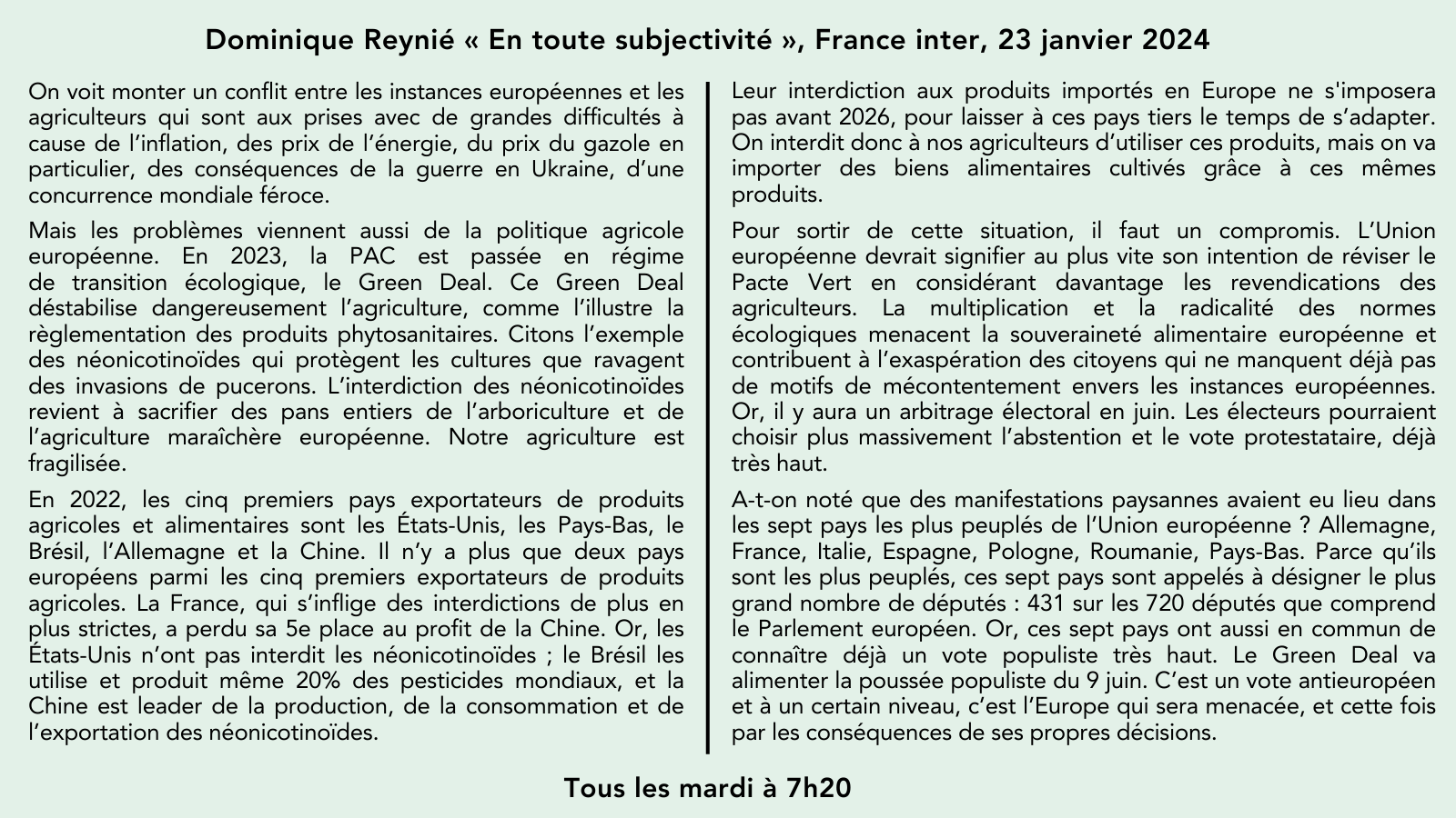 🗨La chronique de @DominiqueReynie sur @franceinter: « Le Green Deal va alimenter la poussée populiste du 9 juin. C’est l’Europe qui sera menacée, cette fois par les conséquences de ses propres décisions. » 👉Les chroniques: https://t.co/QecuhlF5iY 🗓Le mardi à 7h20 pic.twitter.com/6RE7NVGU1p — Fondation pour l’innovation politique (@Fondapol) January 23, 2024