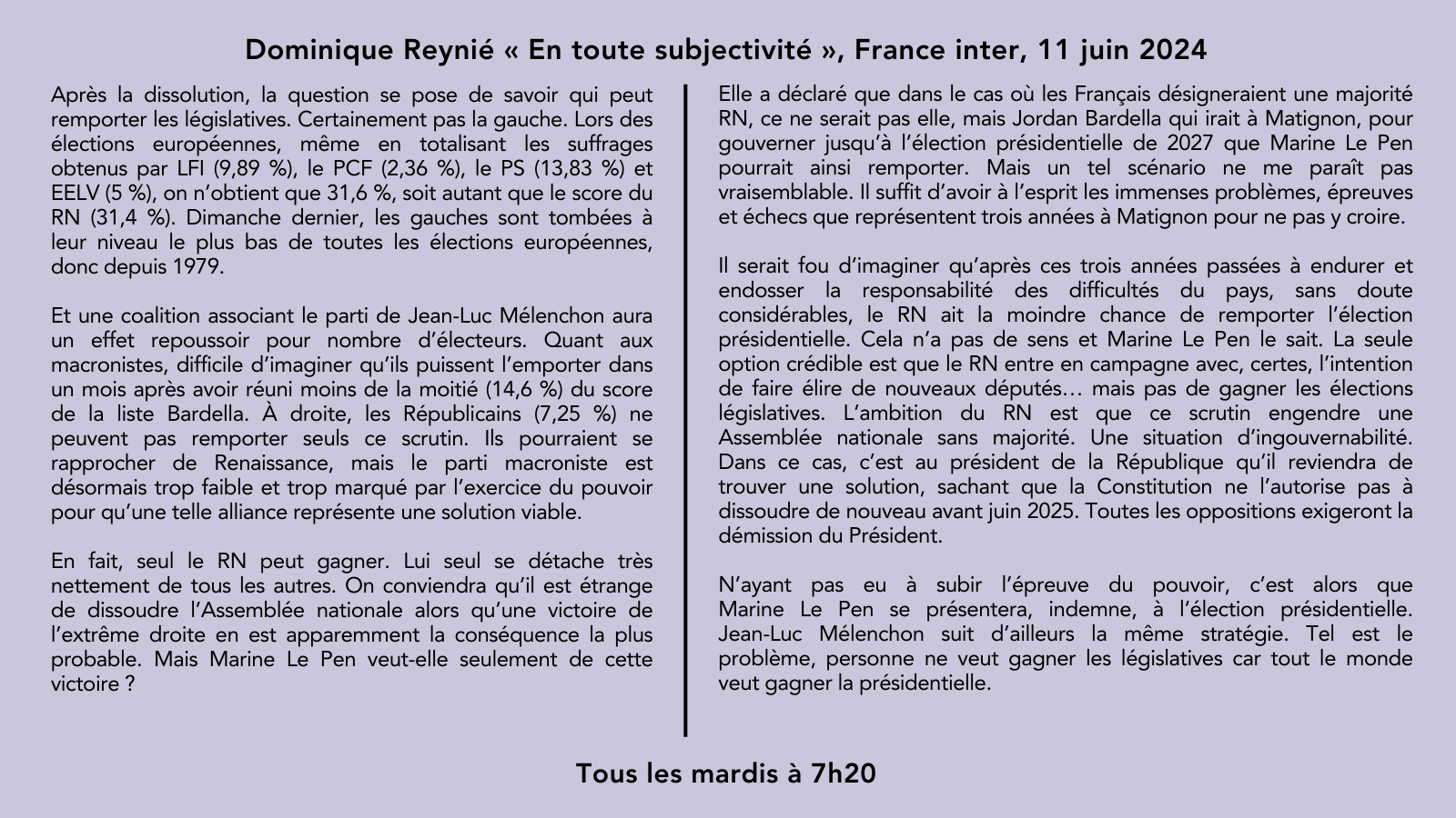 🎙️La chronique de @DominiqueReynie : "Après la dissolution de l’Assemblée nationale, personne ne veut gagner les législatives car tout le monde veut gagner la présidentielle." 👉Les chroniques https://t.co/QecuhlFD8w📷Le mardi à 7h20 pic.twitter.com/sfhXVRO2AE — Fondation pour l’innovation politique (@Fondapol) June 11, 2024