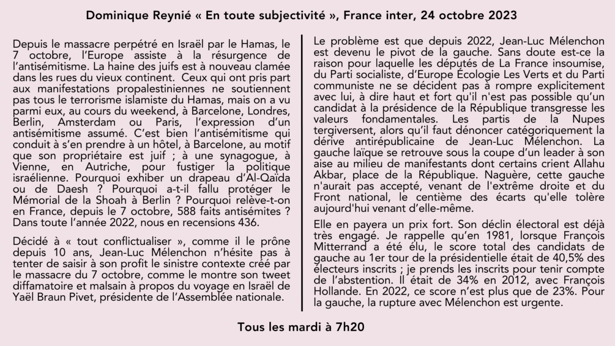 🎙Sur @franceinter la chronique de @DominiqueReynie, invité de @ndemorand: 🗨 »Les partis de la Nupes tergiversent, alors qu’il faut dénoncer catégoriquement la dérive antirépublicaine de Jean-Luc Mélenchon. » 👉Les chroniques: https://t.co/8Y4JhC4SP4 🗓Le mardi à 7h20 pic.twitter.com/1gUhpMLShk — Fondation pour l’innovation politique (@Fondapol) October 24, 2023