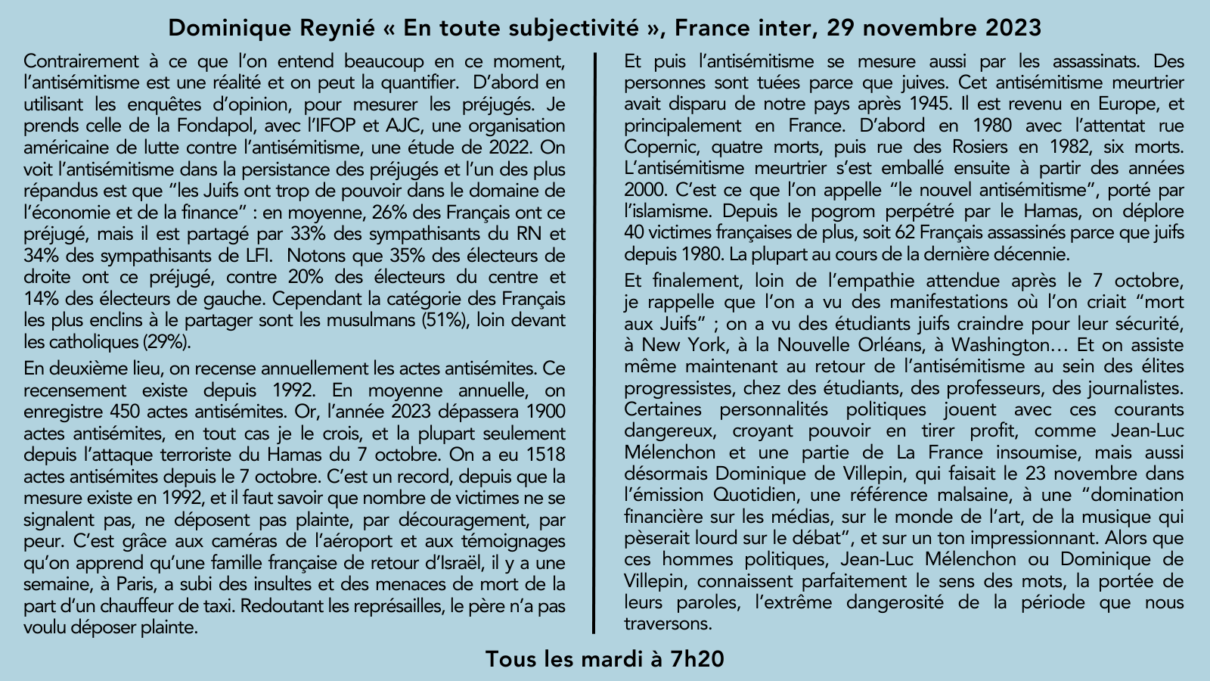 🎙️Sur @franceinter la chronique de @DominiqueReynie: « On assiste au retour de l’antisémitisme au sein des élites progressistes. Certains politiques jouent avec ces courants dangereux, croyant pouvoir en tirer profit. » 👉Les chroniques: https://t.co/QecuhlF5iY 🗓️Le mardi à 7h20 pic.twitter.com/pTRz9OeWcE — Fondation pour l’innovation politique (@Fondapol) November 28, 2023