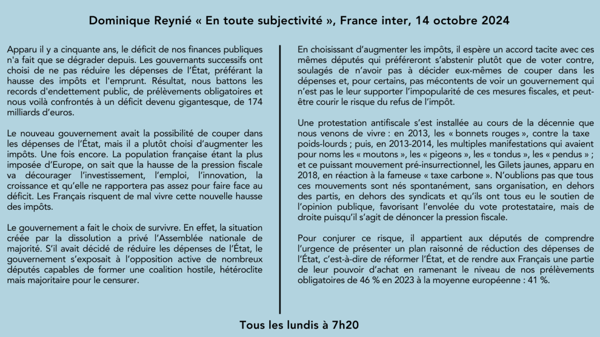 🎙️La chronique de @DominiqueReynie sur @franceinter : « Augmenter les impôts est devenu un risque politique. La population française est la plus imposée d’Europe et nous voyons une protestation antifiscale s’installer. » 👉Les chroniques https://t.co/QecuhlF5iY 📅Le lundi à 7h20 pic.twitter.com/cKTvJLmQNY — Fondation pour l’innovation politique (@Fondapol) October 14, 2024