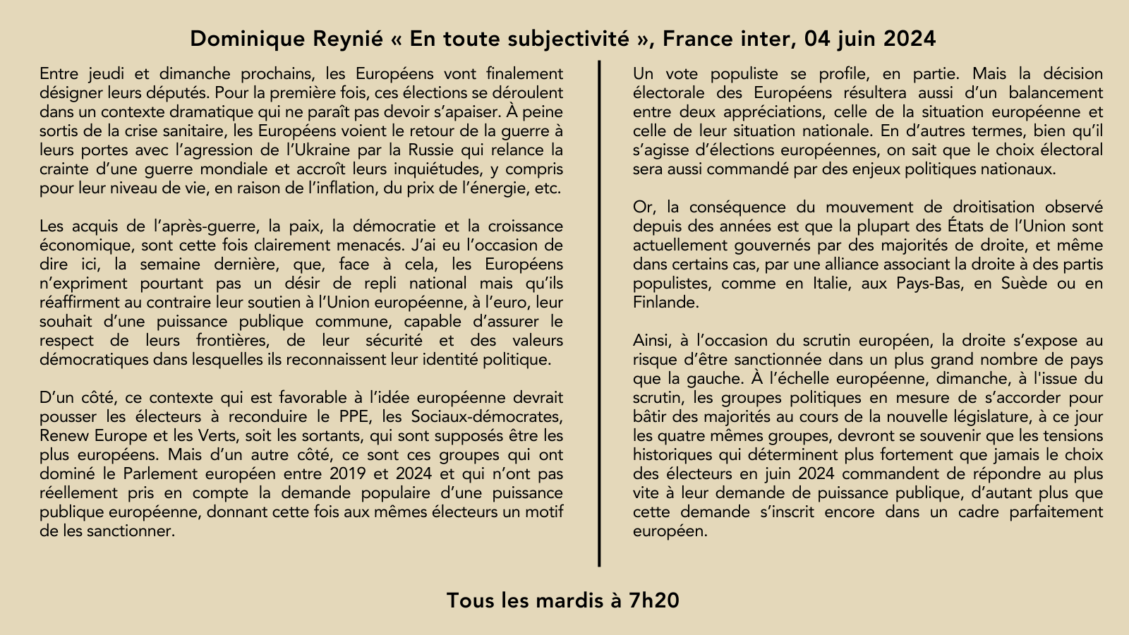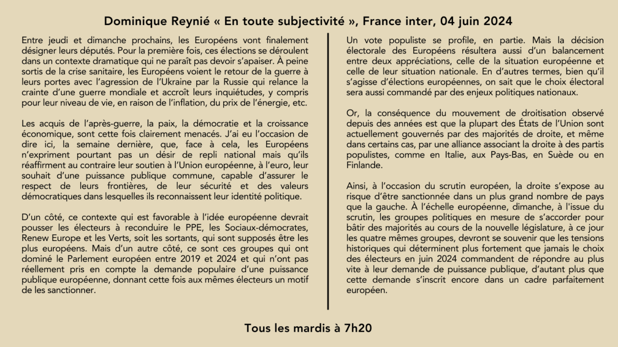 🎙️La chronique de @DominiqueReynie: "À l'issue du scrutin, les groupes en mesure de s’accorder pour bâtir des majorités devront se souvenir que ce qui détermine plus fortement que jamais le choix des électeurs est leur demande de puissance publique européenne" 📅Le mardi à 7h20 pic.twitter.com/nvl6GF8PYm