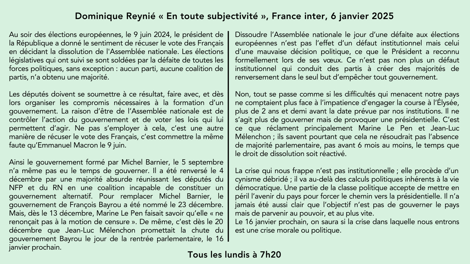 La chronique de @Dominiquereynie sur @franceinter «Pour une partie de la classe politique, il ne s’agit plus de gouverner mais de provoquer une présidentielle. Dans un pays qui va mal, ce cynisme menace la politique d’une faillite morale». pic.twitter.com/HiOojkN7FC