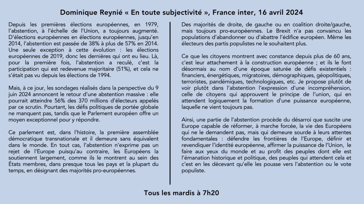 🎙️La chronique de @DominiqueReynie: « L’abstention est l’expression d’une incompréhension des citoyens qui approuvent l’Union, et attendent logiquement la formation d’une puissance européenne, qui ne vient toujours pas ».