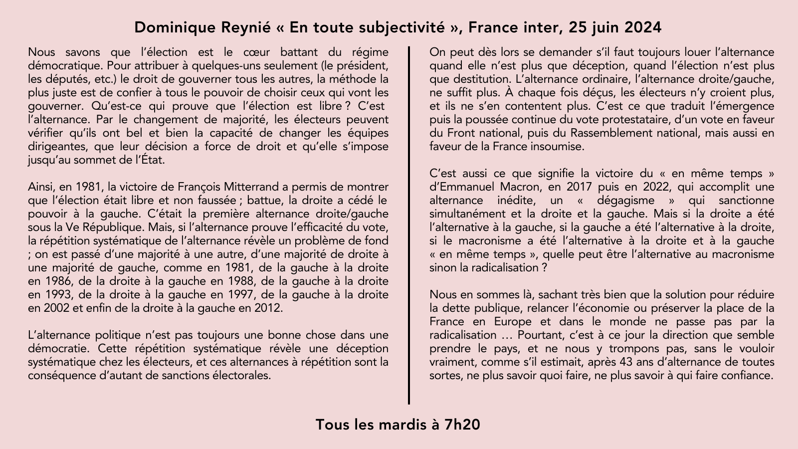 🎙️La chronique de @DominiqueReynie sur @franceinter : "Après 43 ans d'alternances en tous sens, le pays semble ne plus savoir quoi faire, à qui faire confiance." 👉Les chroniques https://t.co/QecuhlF5iY 📅Le mardi à 7h20 pic.twitter.com/sSONxHFse1 — Fondation pour l’innovation politique (@Fondapol) June 25, 2024