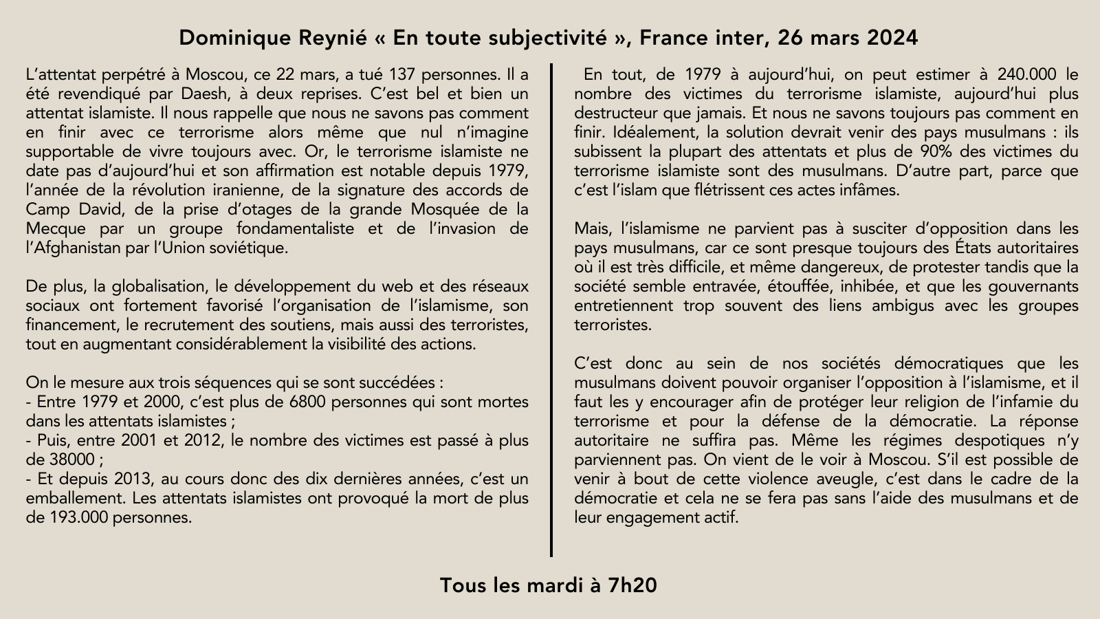 🎙️La chronique de @DominiqueReynie: "Depuis 1979, on peut estimer à 240 000 les victimes du terrorisme islamiste. Nous ne pourrons pas venir à bout de cette violence aveugle sans l’engagement actif des musulmans" 👉Les chroniques https://t.co/QecuhlF5iY 🗓️Mardi à 7h20 pic.twitter.com/JGqEA5B7l5