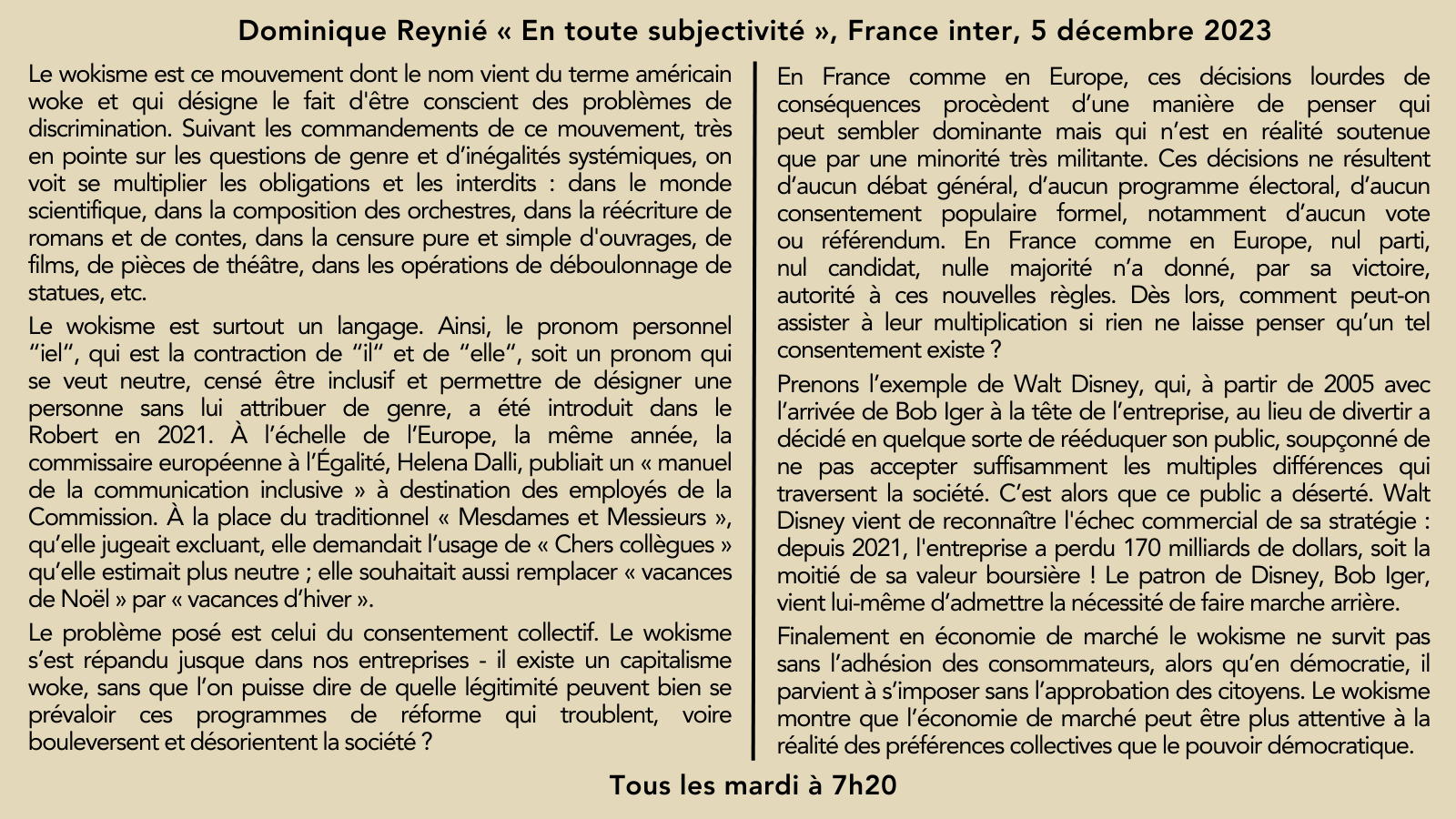 🎙️Sur @franceinter la chronique de @DominiqueReynie: “En économie de marché, le wokisme ne survit pas sans l’adhésion des consommateurs, alors qu’en démocratie, il parvient à s’imposer sans l’approbation des citoyens.” 👉Les chroniques: https://t.co/QecuhlF5iY 🗓️Le mardi à 7h20 pic.twitter.com/Tk7gvcALBI