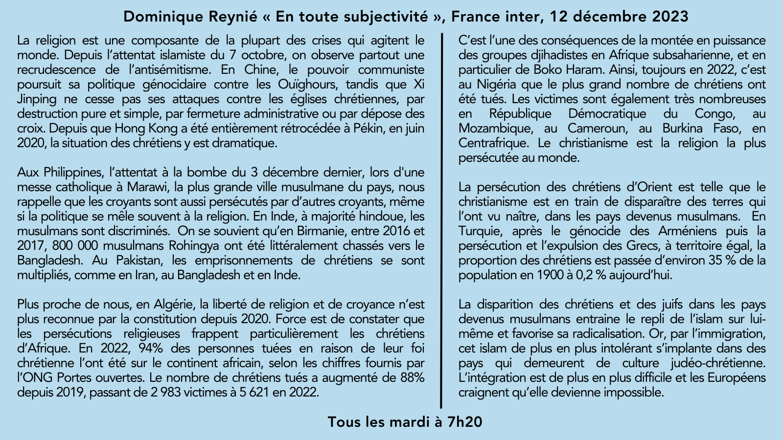 🎙️Sur @franceinter la chronique de @DominiqueReynie :"La disparition des chrĂ©tiens et des Juifs dans les pays devenus musulmans entraĂ®ne le repli de l’islam sur lui-mĂŞme et favorise sa radicalisation."👉Les chroniques: https://t.co/QecuhlF5iY🗓️Le mardi Ă 7h20 pic.twitter.com/dQo1JcKCYF — Fondation pour l’innovation politique (@Fondapol) December 12, 2023