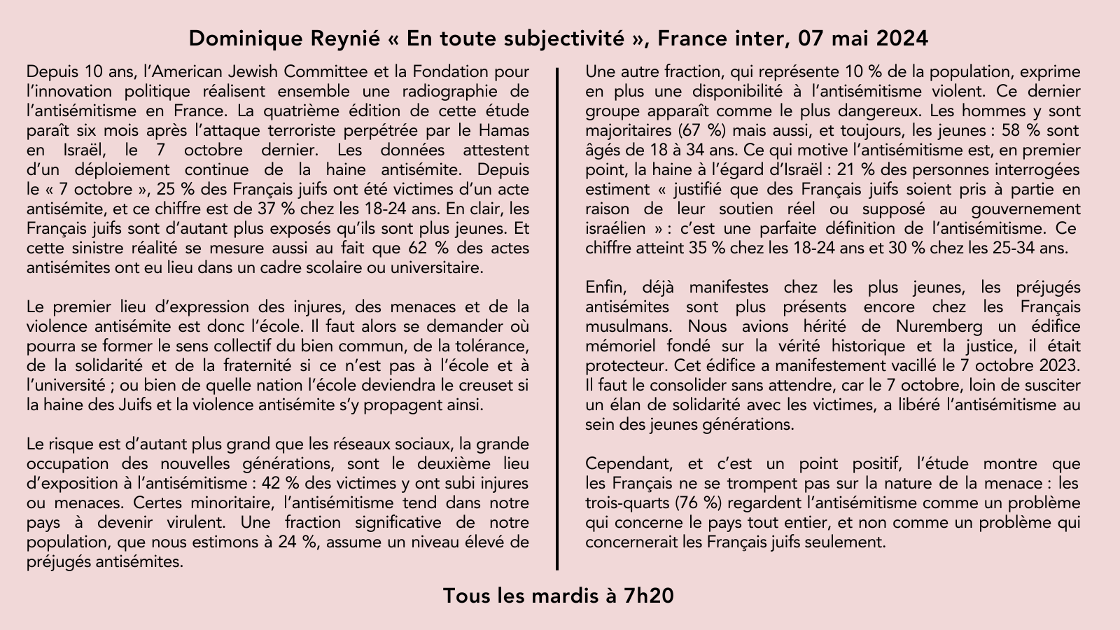🎙️La chronique de @DominiqueReynie: "Il faut consolider l’édifice mémoriel fondé sur la vérité historique et la justice, car le 7 octobre, loin de susciter un élan de solidarité avec les victimes, a libéré l’antisémitisme" 👉https://t.co/QecuhlF5iY 🗓️Le mardi à 7h20 pic.twitter.com/Om7ZRKVUPn