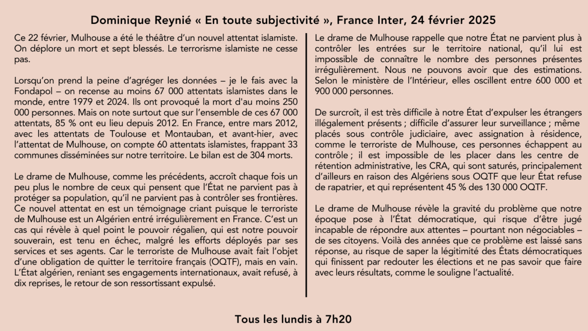 «L’attentat de Mulhouse conforte l’opinion d’un pouvoir régalien tenu en échec, attribuant la faiblesse de l’État à sa nature démocratique». pic.twitter.com/xcPDafOnTt