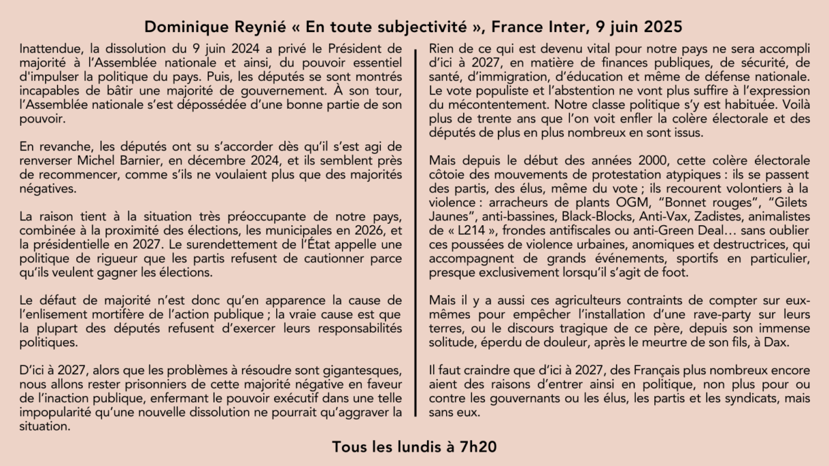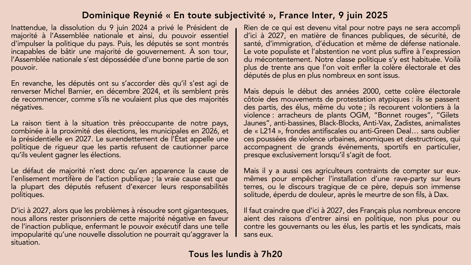 Sur @franceinter@DominiqueReynie: “L’inaction publique fait craindre que, d’ici à 2027, des Français plus nombreux encore aient des raisons d’entrer ainsi en politique, non plus pour ou contre les gouvernants ou les élus, les partis et les syndicats, mais sans eux.” pic.twitter.com/Bvpmml9I5Q