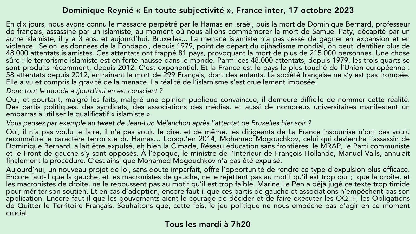 🎙Sur @franceinter, la chronique de @DominiqueReynie, invitĂ© de @ndemorand: đź—¨MalgrĂ© les faits, des partis, syndicats, associations, mĂ©dias et universitaires manifestent un embarras Ă utiliser le qualificatif “islamiste” 👉Les chroniques: https://t.co/8Y4JhC4SP4 đź—“Le mardi Ă 7h20 pic.twitter.com/CQtZgFhtkP — Fondation pour l’innovation politique (@Fondapol) October 17, 2023