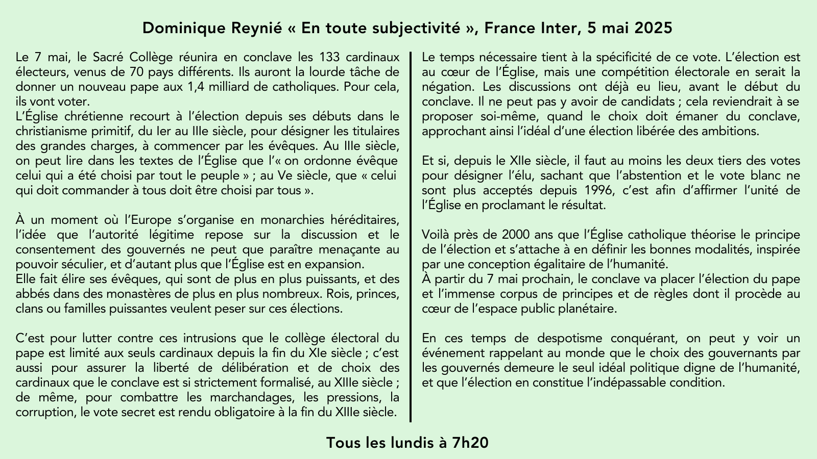 Sur @franceinter, @DominiqueReynie: “En ces temps de despotisme conquérant, l’élection du #pape rappelle au monde que le choix des gouvernants par les gouvernés demeure le seul idéal politique digne de l’humanité et que l’élection en est l’indépassable condition.” pic.twitter.com/ijeV0dJq4p