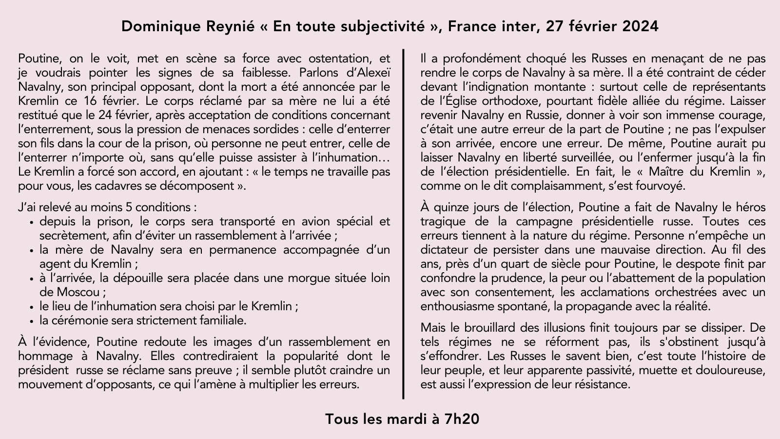 🎙️La chronique de @DominiqueReynie sur @franceinter: "Poutine s’est fourvoyé. À quinze jours de l’élection, il a fait de Navalny le héros tragique de la campagne présidentielle russe".👉Les chroniques: https://t.co/QecuhlF5iY 🗓️Le mardi à 7h20 pic.twitter.com/OJXIE5XisV