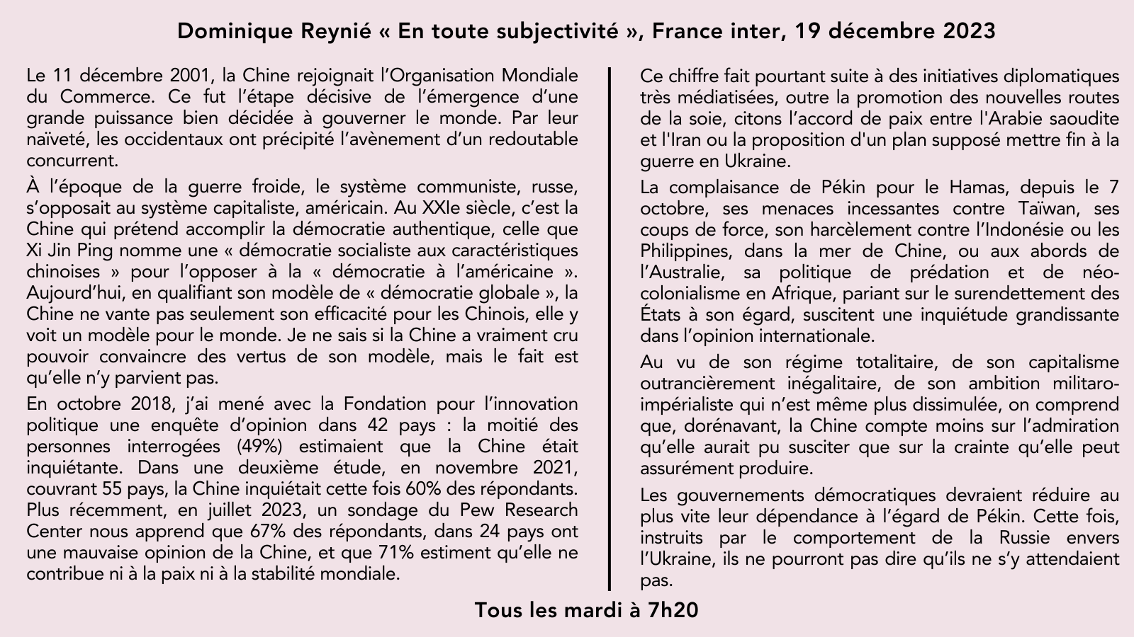 Sur @franceinter la chronique de @DominiqueReynie: “On comprend que dorénavant, la Chine compte moins sur l’admiration qu’elle aurait pu susciter que sur la crainte qu’elle peut assurément produire.” 👉Les chroniques: https://t.co/QecuhlF5iY 🗓️Le mardi à 7h20 pic.twitter.com/1mxy8ytZVh — Fondation pour l’innovation politique (@Fondapol) December 19, 2023