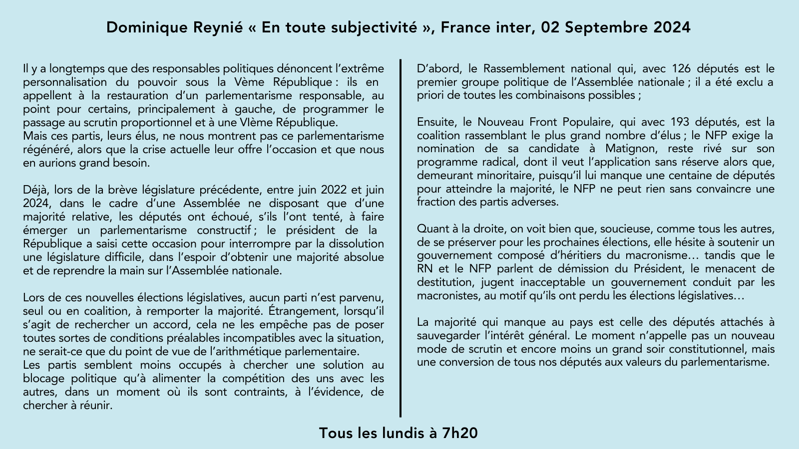🎙️La chronique de @DominiqueReynie sur @franceinter: "La majorité qui manque au pays est celle des députés attachés à sauvegarder l’intérêt général."👉Les chroniques https://t.co/QecuhlF5iY📅Le lundi à 7h20 pic.twitter.com/iNKQHa6xOM — Fondation pour l’innovation politique (@Fondapol) September 2, 2024