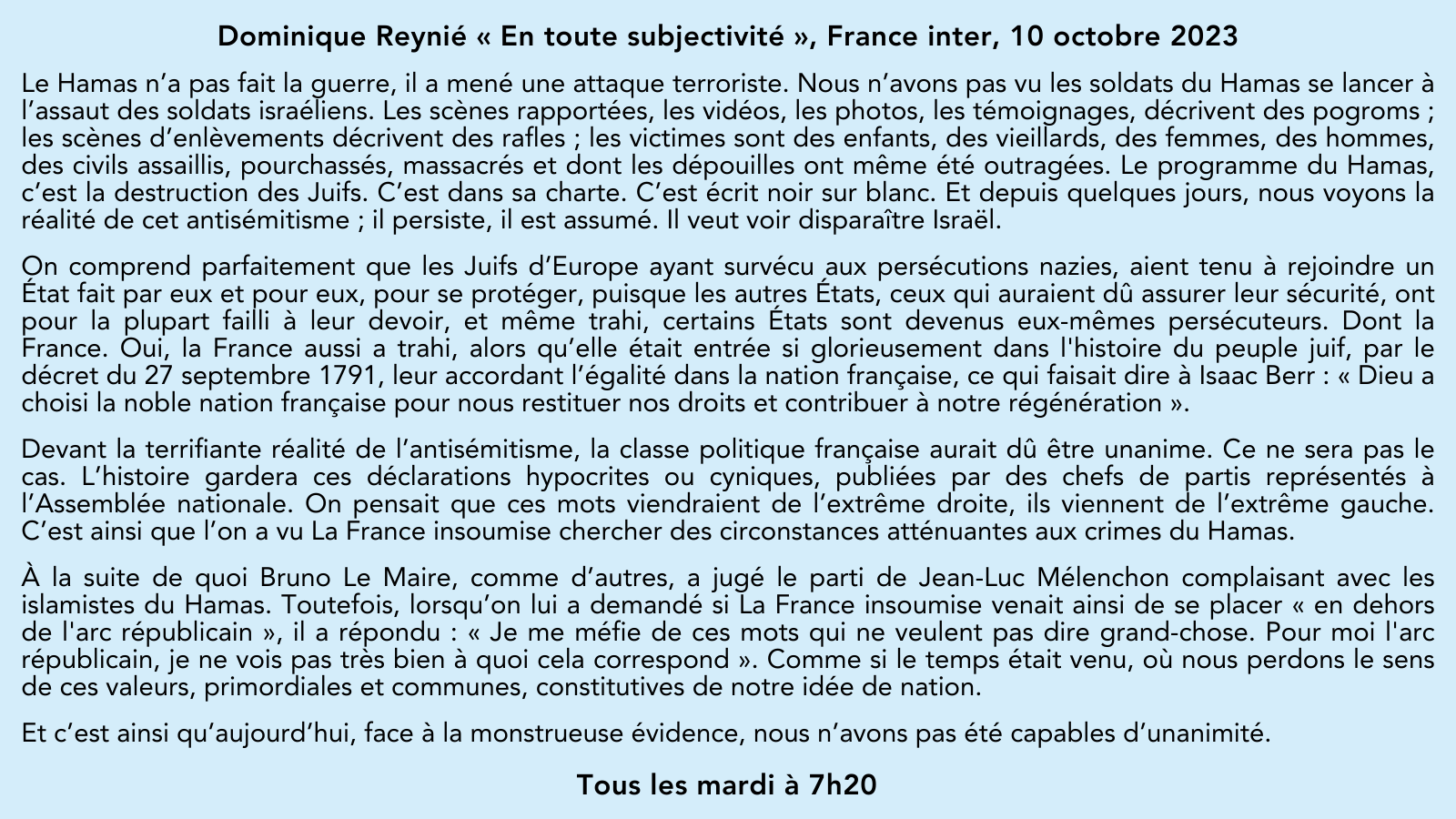 🎙️ Sur @franceinter, la chronique de @DominiqueReynie, invité de @ndemorand: “Devant la terrifiante réalité de l’antisémitisme, la classe politique française aurait du être unanime. Ce ne sera pas le cas.” 👉 Les chroniques: https://t.co/3HWLf0R5rs 🗓️ Le mardi à 7h20 pic.twitter.com/rfrqWPxFPC — Fondation pour l’innovation politique (@Fondapol) October 10, 2023