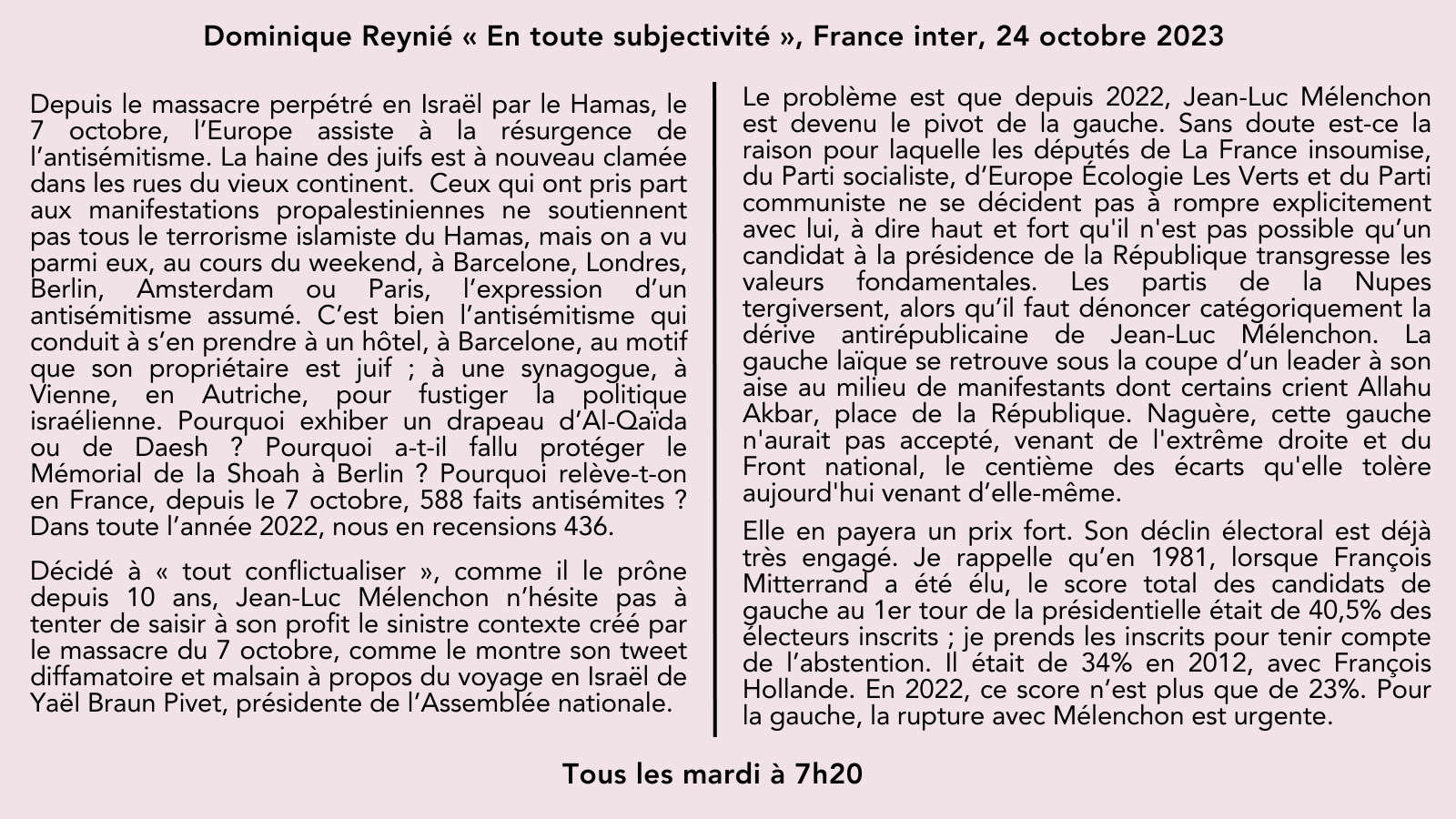 🎙Sur @franceinter la chronique de @DominiqueReynie, invité de @ndemorand: 🗨”Les partis de la Nupes tergiversent, alors qu’il faut dénoncer catégoriquement la dérive antirépublicaine de Jean-Luc Mélenchon.” 👉Les chroniques: https://t.co/8Y4JhC4SP4 🗓Le mardi à 7h20 pic.twitter.com/1gUhpMLShk — Fondation pour l’innovation politique (@Fondapol) October 24, 2023