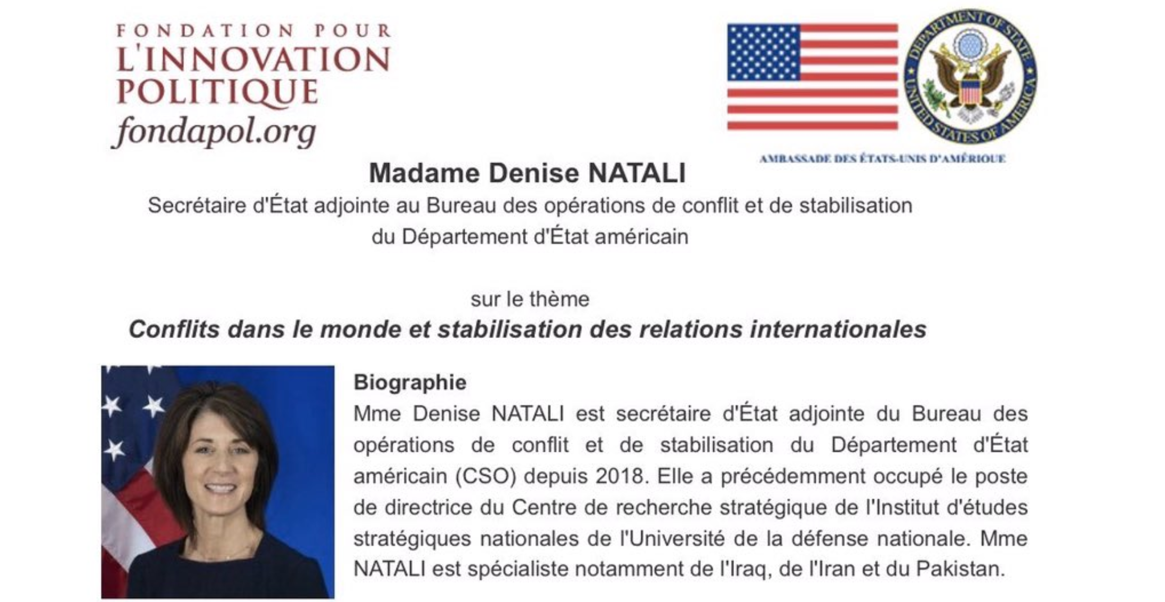 The Fondation pour l’innovation politique hosted Dr. Natali Denise, Assistant Secretary for the Bureau of Conflict and Stabilization Operations at the U.S. Department of State, to discuss with Dominique Reynié, Executive Director of the Fondation pour l’innovation politique, on the theme of “Conflicts in the world and stabilization of international relations”.