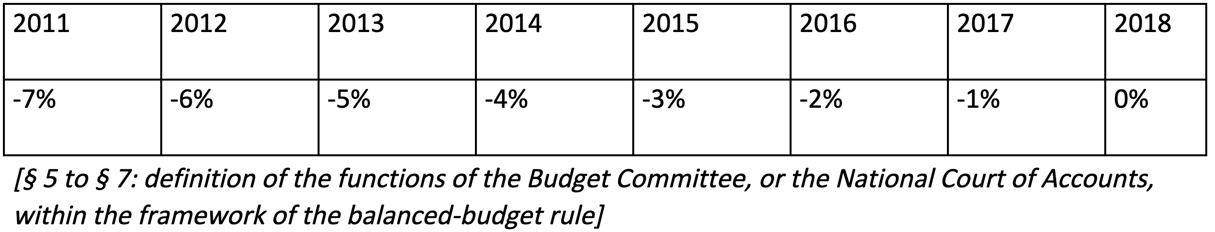 - 4 )Transitional arrangements: “From [2011 to 2018], general-government deficits (central government + social security), adjusted of the cyclical component, expressed as a percentage of GDP, are capped at: [broken down between the central-government and social-security budgets]