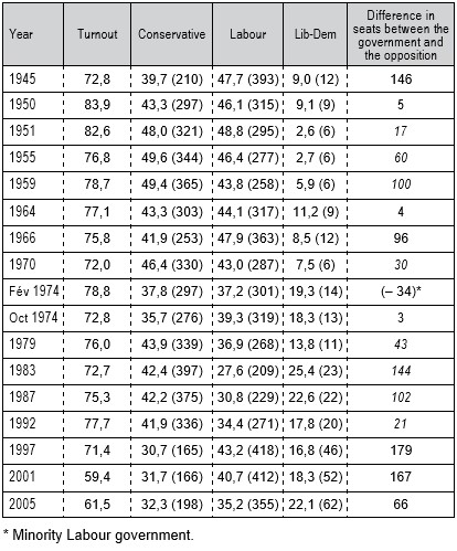 Historically speaking, we would agree with the thesis that beneath the UK’s apparent two-party alternation, there is, in reality one dominant party at most times.22 Thus, the Tories dominated from 1783 to 1832, before conceding half a century of Whig-Liberal supremacy. From 1886, they were dominant until 1992. The period since could be described as one of transition. Labour has never been in office long enough to assume this kind of hegemony. One way to describe continuing his- torical strength is to point out that from 1834 to 1945, Conservatives led or were dominant within 22 governments out of a total of 37; their occupancy of office covered some 60 years out of a possible 114.23