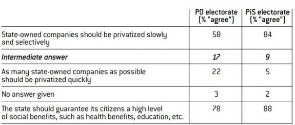 Looking at the answers regarding the role of the state in the country’s economy, it becomes clear that PO’s electorate is not dominated by fervent free-market liberals. Even though the party’s supporters are much more likely than those of PiS to wish for accelerated privatization or a single tax rate for all, the majority of PO’s electorate seems to advocate caution in relation to privatization, accept progressive tax rates and support the welfare state. These findings strongly challenge the idea that there is a “social Poland” and a “free-market liberal Poland”.