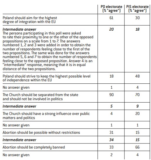 Poland’s degree of integration with the EU, the role played by the Catholic Church in public affairs as well as abortion rights are three issues on which the PO and PiS electorates disagree strongly. Remarkably, a majority of backers of both parties is in favor of the separation of church and state.