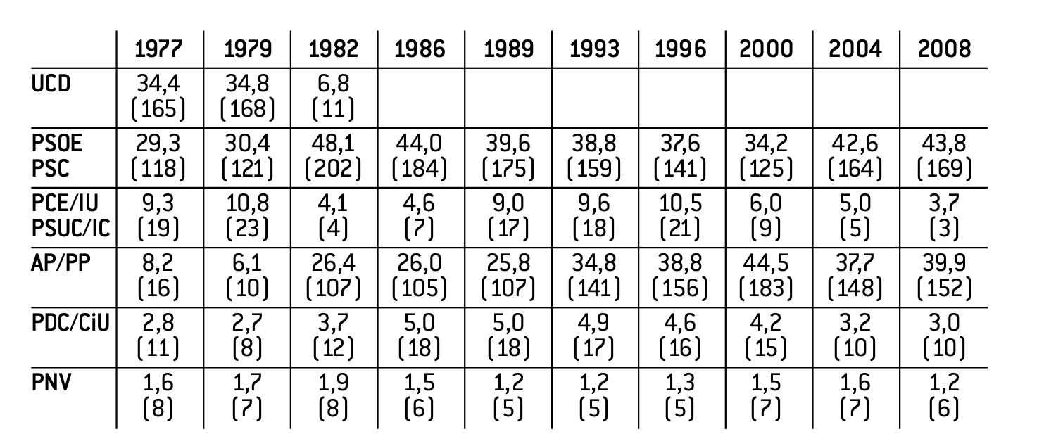 After the 1977 and 1979 elections, during which a majority of the Right’s seats were occupied by the Union of the Democratic Centre (UCD), the People’s Alliance (AP) won a large number of seats in 1982, establishing itself as the leading representative of the Right, despite the two subsequent elections’ disheartening results. In 1993, the Aznar-led PP made substantial gains which it consolidated in 1996 and in 2000 – the years in which it obtained its best results. In the last two electoral contests, the PP became the second strongest political power, yet maintained a solid electoral base which positioned it as the Spanish Right’s biggest party and as the Socialist government’s sole credible alternative.
