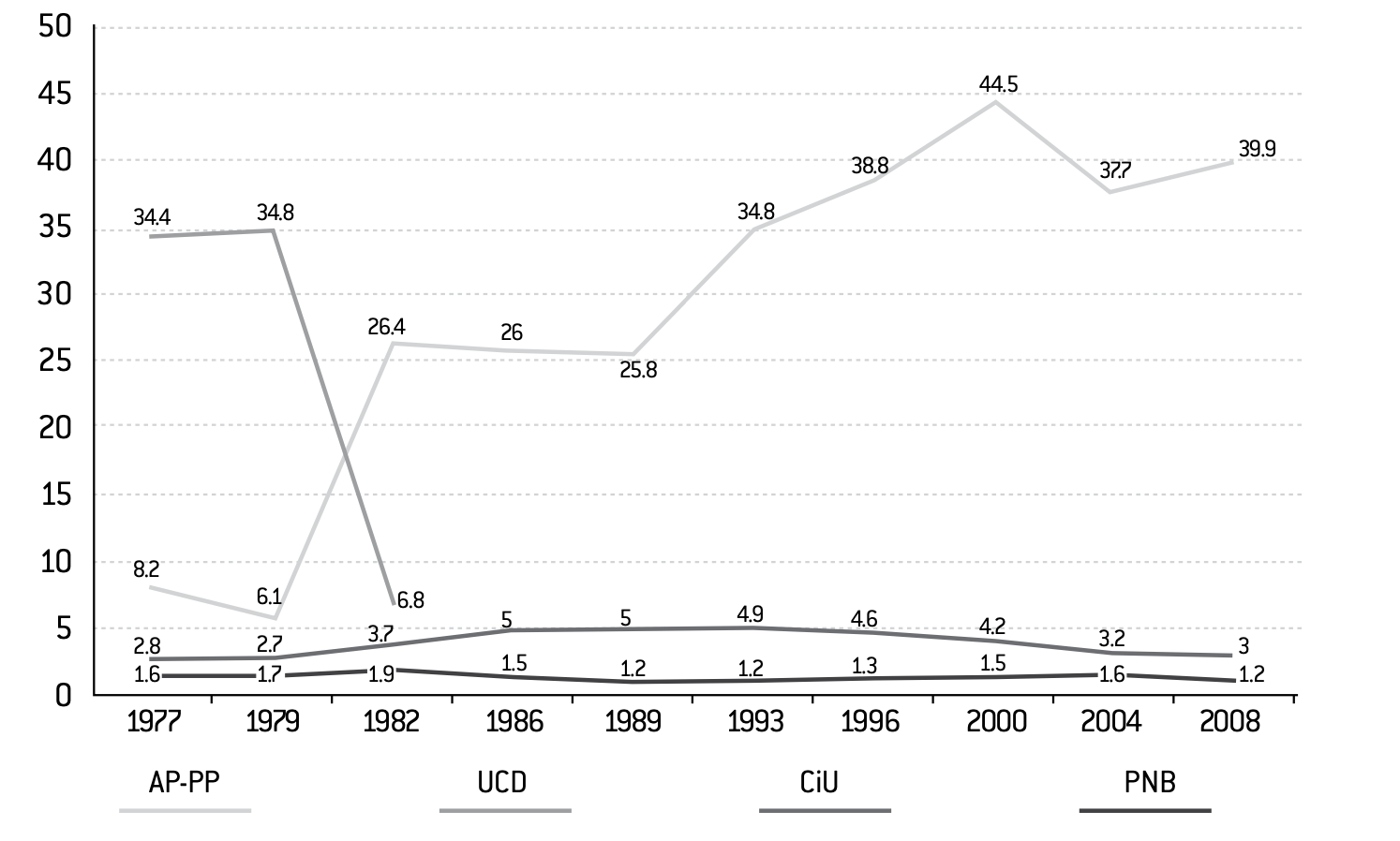 Graph 1 highlights two major trends in the Spanish Right’s voting results from the beginning of the democratic era in 1977: the progression of the popular movement (AP and later PP) and its retention as a possible alternative after its departure from the government on one hand, and the lesser – though often decisive – role of the Catalan and Basque right- wing groups on the other.