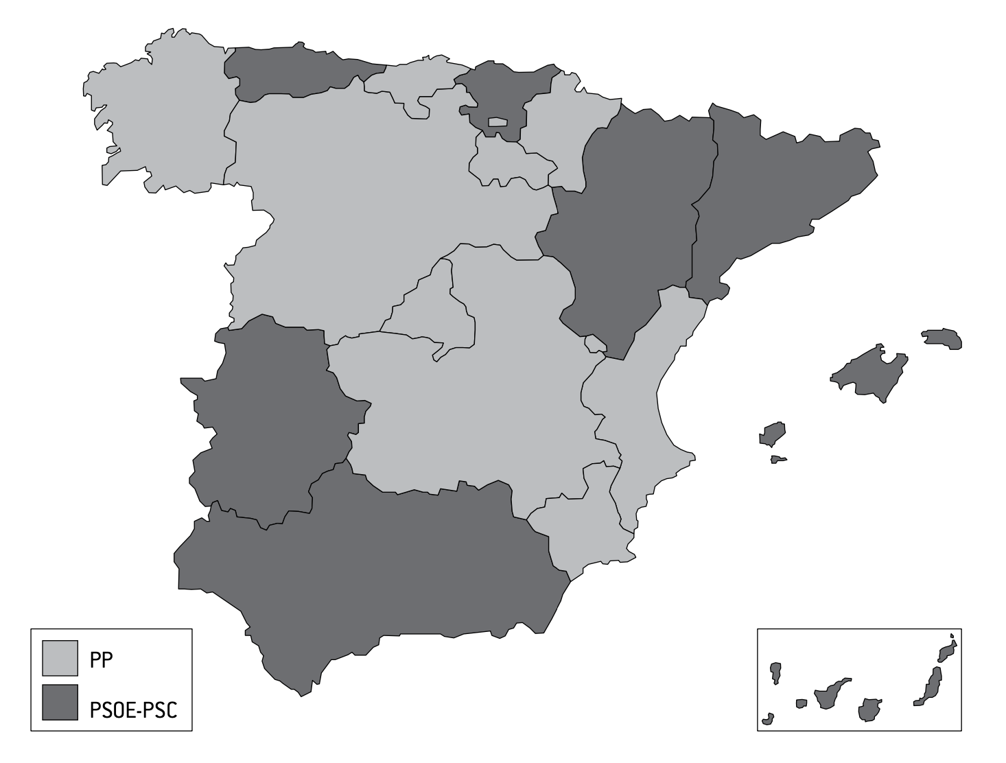 In the June 2009 European elections, the People’s Party consolidated its positions in the aforementioned regions and recaptured first place in the Balearic and Canary Islands. In nearly all of the Autonomous Communities, the political contest was dominated by the confrontation between the PSOE and the PP, duplicating the national configuration. Catalonia and the Basque Country were natural exceptions: the political forces present were more diverse due to the regionalist issue. The Catalan and Basque Nationalist Parties in these communities were the Centre Right’s main political force. Also, the Socialists have their own organisation in Catalonia, the PSC, which is legally and formally differentiated and autonomous from the PSOE.