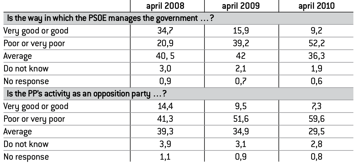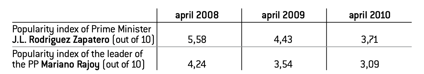 As Tables 2 and 3 indicate, the Spanish citizens’ increasingly negative opinion of governmental policy did not at all cause them to have a better opinion of the PP. The latter’s leader, Mariano Rajoy, thus appears unable to present a credible alternative for change. The debates between the opposition and the government which punctuate the release of macroeconomic data have not enabled the PP to strengthen its credibility. Voters believe that if the Party were in charge of the government, it would not contribute better solutions to the crisis. In Parliament, the PP introduced only a small number of proposals which gained the support of the other opposition parties. Only a few of them – notably those dealing with reducing public spending (eliminating some senior official posts, ministries, etc.) – won support from other groups. This stagnation of the PP was exacerbated by accusations of corruption which it had to confront. In the last two years, some embezzlement cases have tainted the management of the various Autonomous Communities which the Party now governs (Valencian Community, Madrid, Castile-León) or recently governed (Balearic Islands), and the financial leadership of the Party itself. The reaction of Mariano Rajoy and of his entourage to these problems appeared inadequate, further damaging his credibility in the public’s eyes.