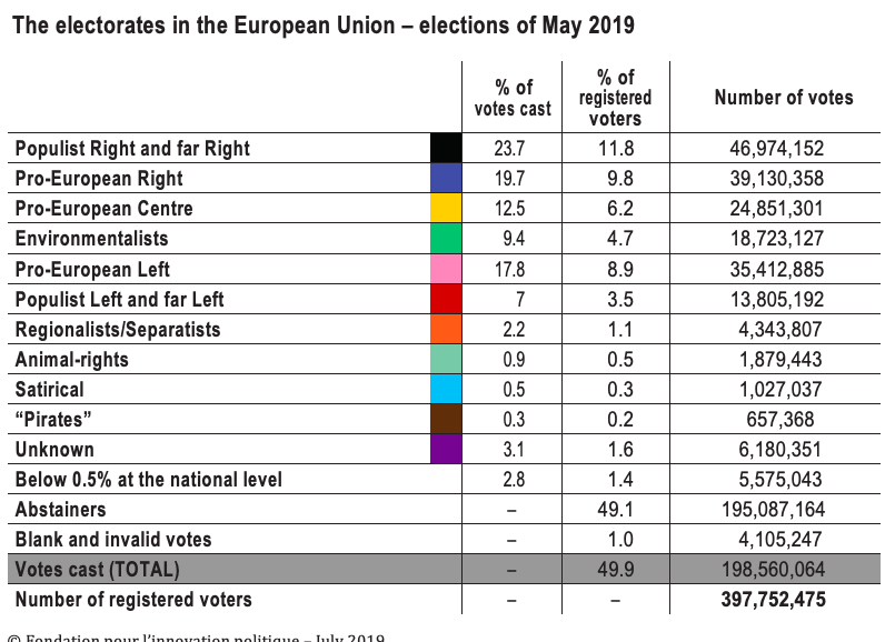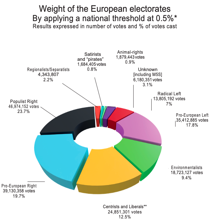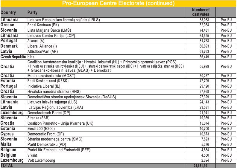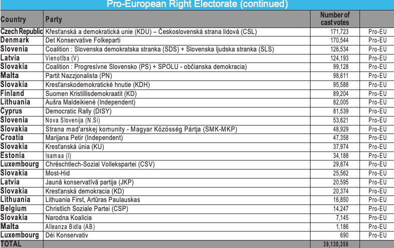 – Within the vote in favour of the pro-European lists, the centre and right-wing electorate received 63.981.659 votes and represented 32.2% of the votes cast and 16% of the total number of registered voters, i.e. almost double the electorate of the pro-European left: 34,412,885 votes, 17.8% of votes cast and 8.9% of the total number of registered votes.