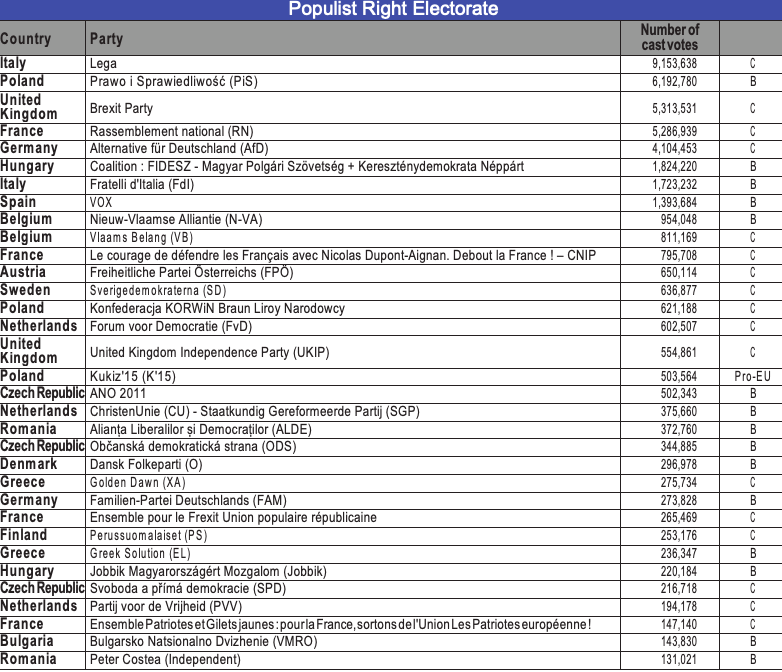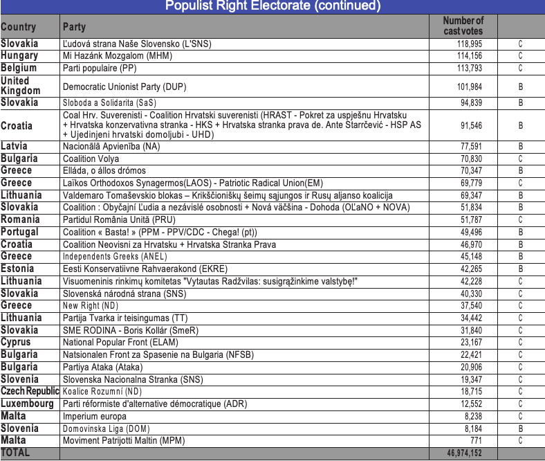 The “populist right and extreme right” electorate consists of the votes in favour of right-wing and extreme right-wing parties which have an adversarial relationship with the European Union as an institution, or even with the idea of a European Union. The reader will therefore find votes in favour of political parties who are members of the European People’s Party (EPP), such as Viktor Orbán’s Fidesz, within this electorate.
