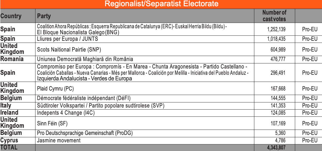 With more than 4 million votes, the regionalist/separatist electorate is mainly concentrated in Spain (Free for Europe, with 1.018.435 votes for the independence of Catalonia, and Republics Now! attaining 834,749 separatist votes across numerous regions of Spain), Scotland (Scottish National Party with more than 600.000 votes) and Romania (Democratic Alliance of Hungarians in Romania, 476.777 votes).