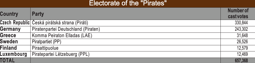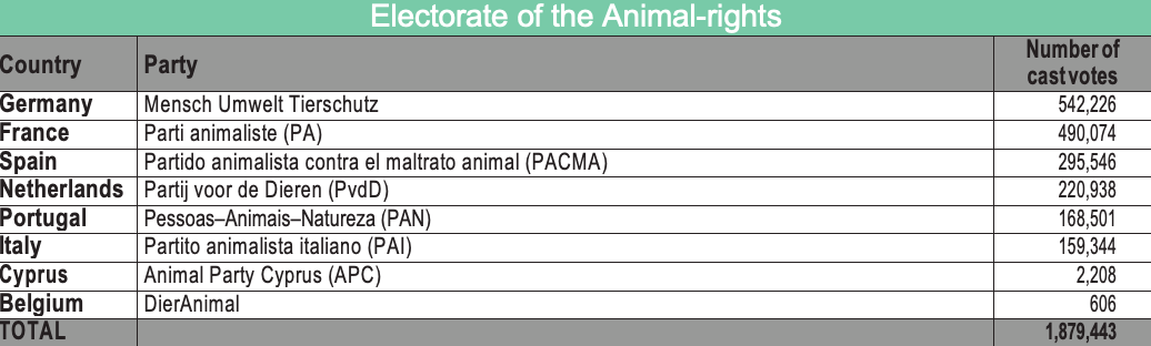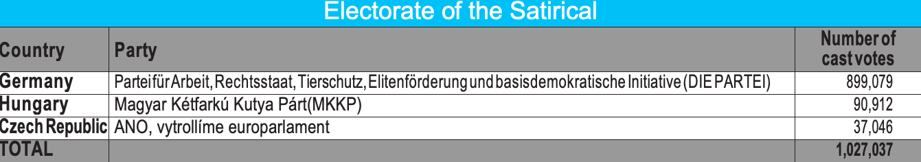 Atypical and/or emerging electorates, composed of animal-rights, “pirate” and satirical lists, which represent 3.563.848 votes, thus have no weight in the European Parliament. The multitude of small, unrepresented national parties therefore renders a considerable number of votes invisible.