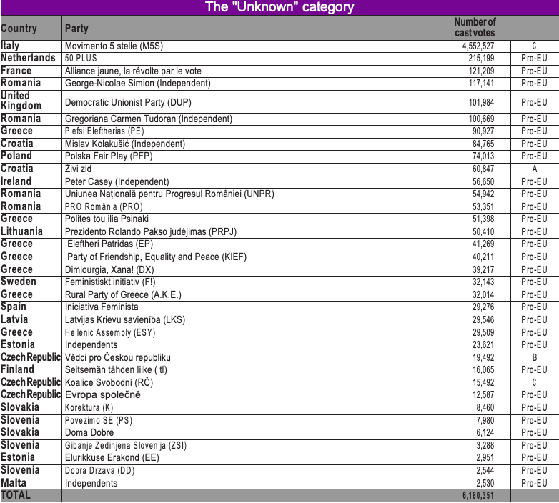 The “Unknown” category includes votes in favour of lists whose political orientation is difficult to identify. The best known case, and the only quantitatively significant one, is that of the 5-star Movement (M5S) in Italy (4.552.527 votes). In general, these votes favour lists that promote the causes or interests of particular social groups, e.g. the “Feminist Initiative” in Sweden, or retirees’ interest in lists such as “50+” in the Netherlands.