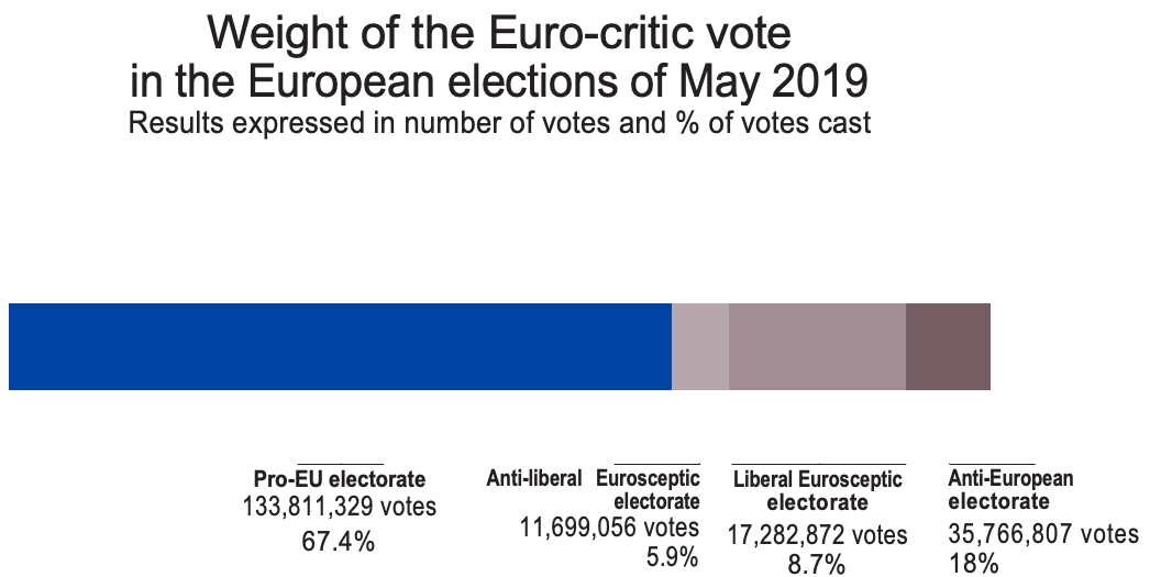 This work aims notably to quantify the number and share of voters who see their views reflected in a discourse which is markedly hostile towards the European Union. In the European elections in 2019, according to our definitions and classification, there were 99 Eurosceptic lists that exceeded the threshold of 0.5% of votes cast. This represents 32.6% of the votes cast, i.e. 64.748.735 votes and 16.2% of registered European voters.