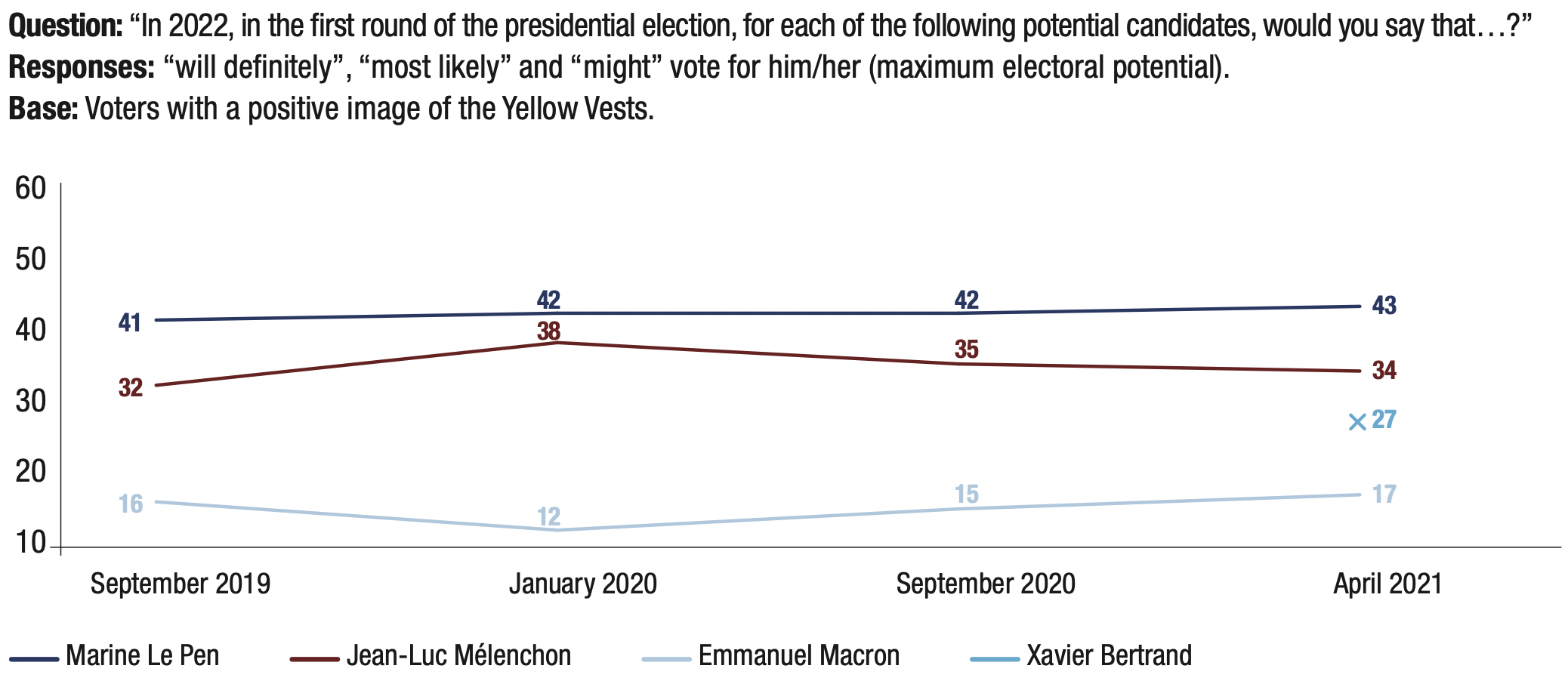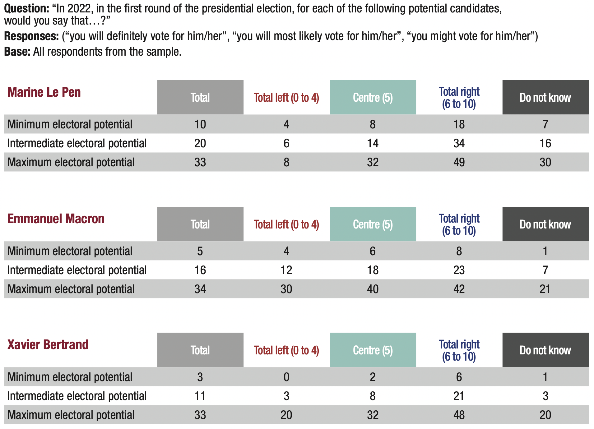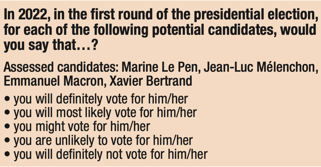 Emmanuel Macron’s minimum electoral potential is 5%, while his intermediate electoral potential amounts to 16%. A newcomer among likely presidential candidates, Xavier Bertrand obtained 3% of minimum electoral potential and 11% of intermediate electoral potential.