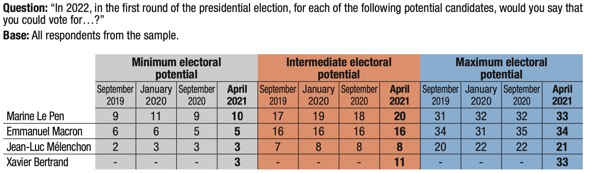 Lastly, Jean-Luc Mélenchon has minimum electoral potential of 3%, while his intermediate electoral potential is 8%.