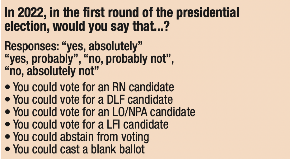 2. The potential for electoral protest remains massive: 78% of respondents are still contemplating voting for the RN, LFI, DLF or LO/NPA, abstain from voting, or casting a blank ballot in the first round of the 2022 presidential election.